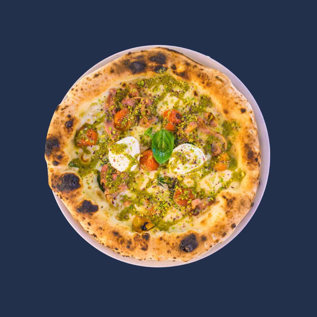 Mozzarella fiordilatte, pancetta affumicata, pomodori confit, bocconcini di bufala campana DOP, pesto di pistacchio, granella di pistacchio e basilico